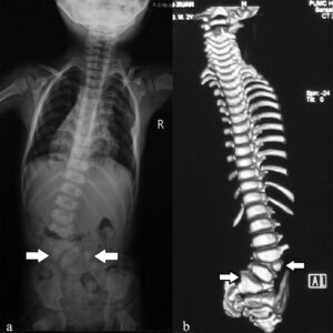上手のような先天的な背骨の骨の奇形と変形が見られます。